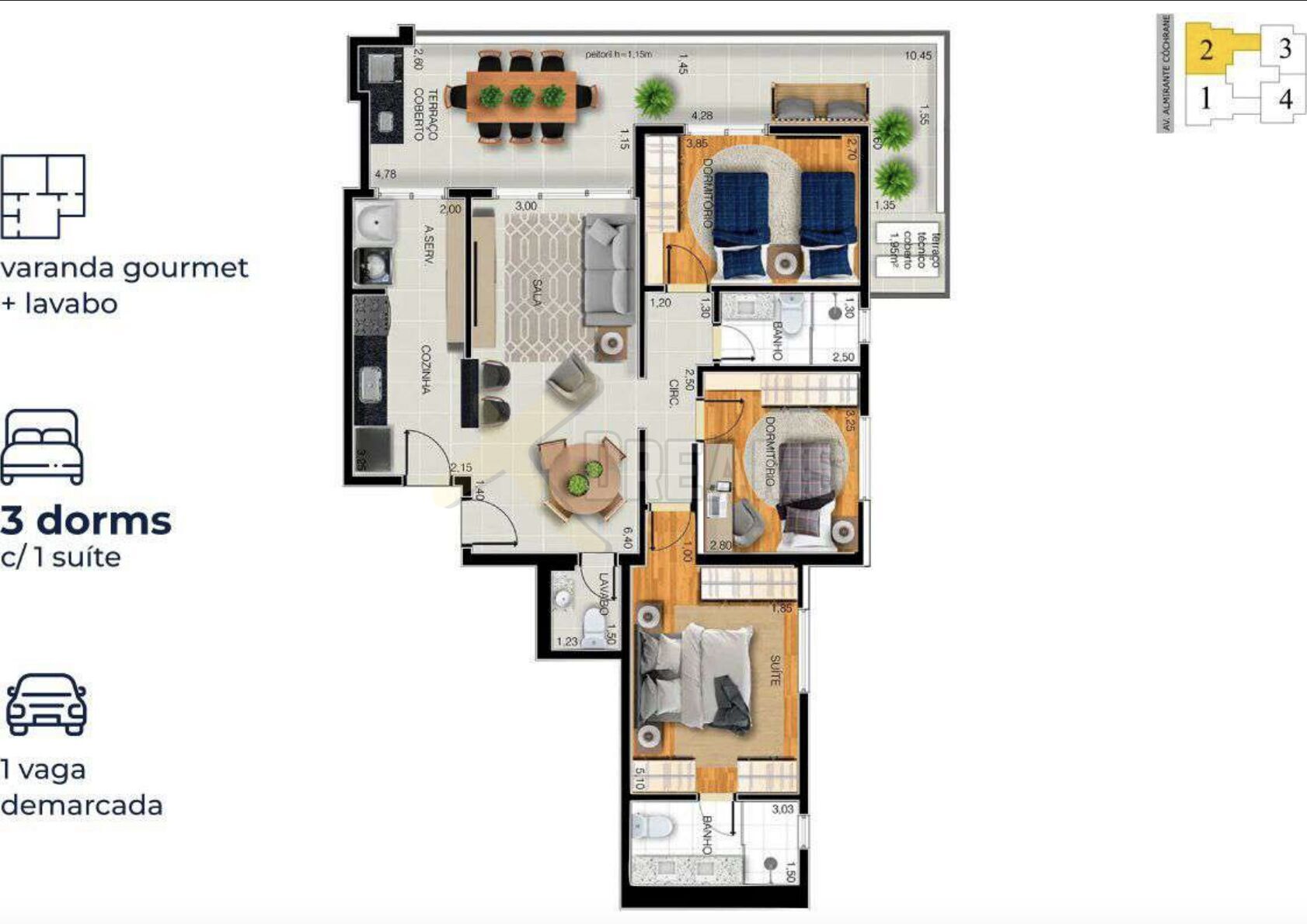 São apartamentos de 2 e 3 dormitórios com varanda gourmet e pertinho da praia. A área de lazer está localizada na cobertura do condomínio, que possui vista mar e oferece um visual lindo para os moradores.